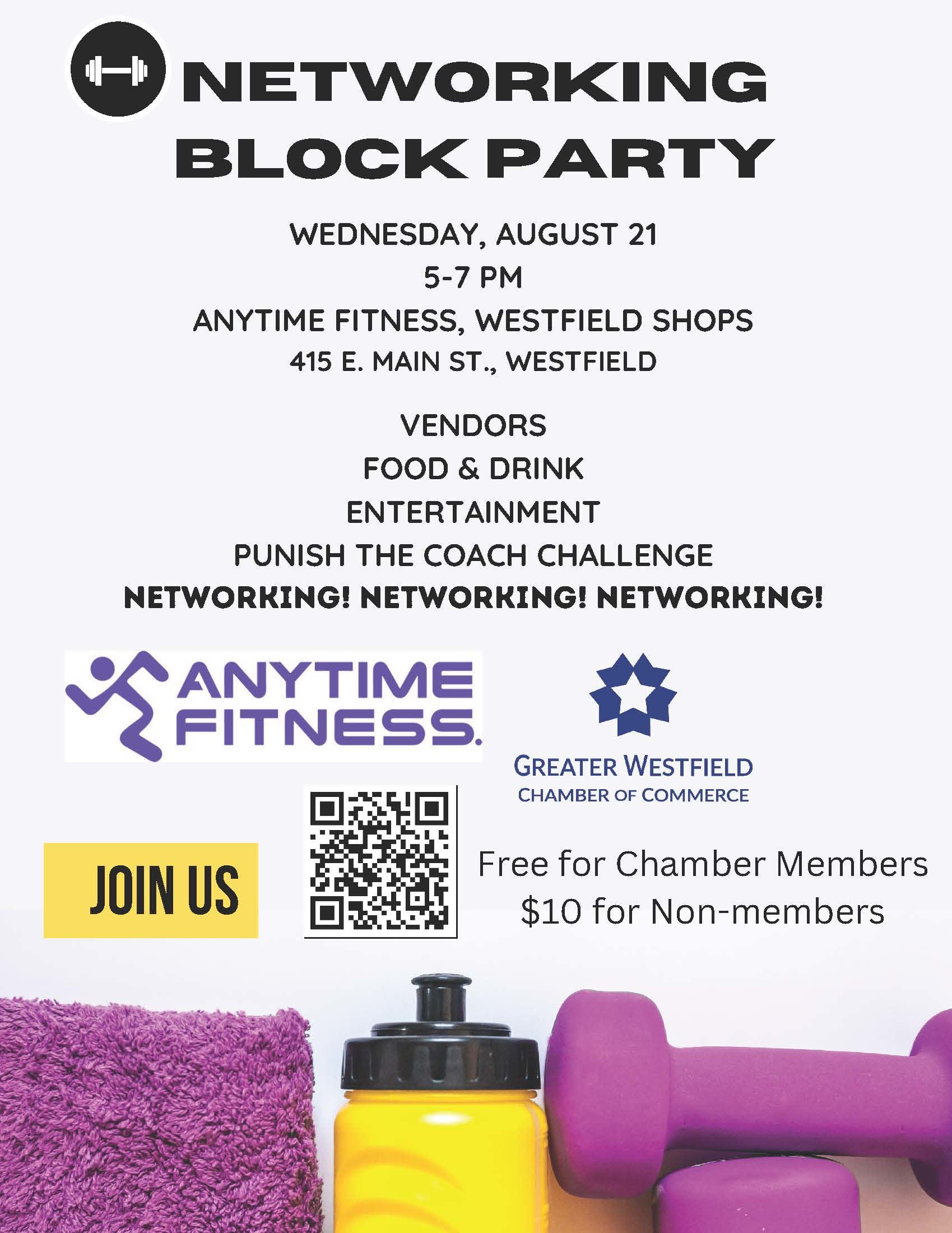 Meet with fellow members, potential customers, partners, and new friends for a fun evening of networking, food and drink, and entertainment. Don't miss a chance to "Punish the Coach" -- Anytime Fitness coaches will accept challenges with all proceeds going toward Anytime Fitness's Healthy Happens Scholarship.